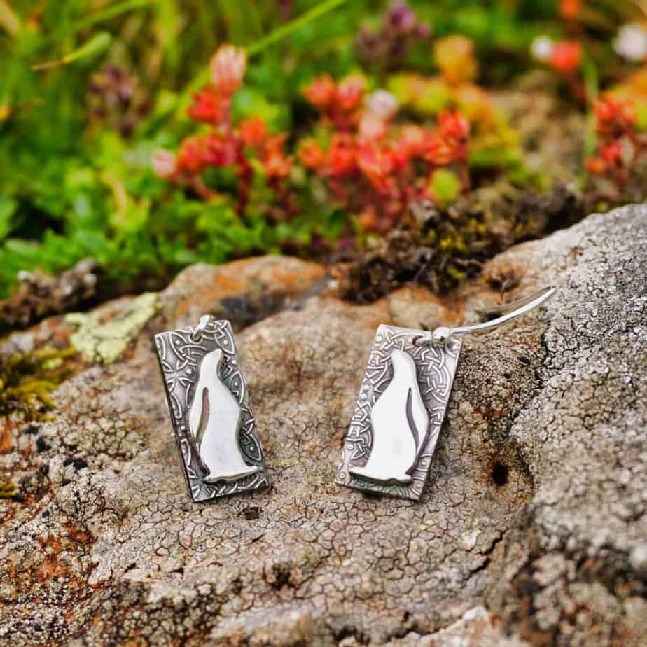 Hares in the mythical moongazing pose against a Celtic background. Made from recycled silver in the Isle of Mull, these earrings celebrate the island’s wildlife and heritage. By Drift Designs.