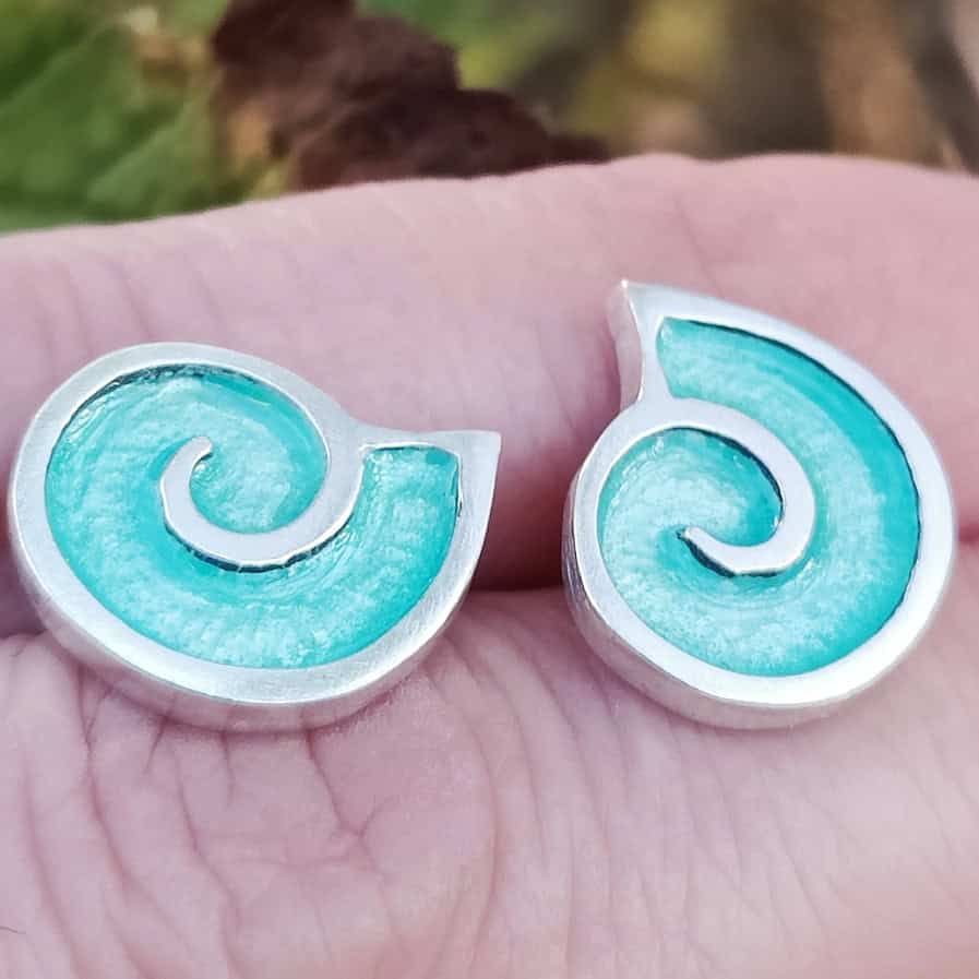Thos pair of sterling silver earrings with sea blue and green vitreous enamel has been inspired by fossil finds on the Jurassic coast. Handmade and hallmarked in Edinburgh by Marion Miller in Stronsay, Orkney.