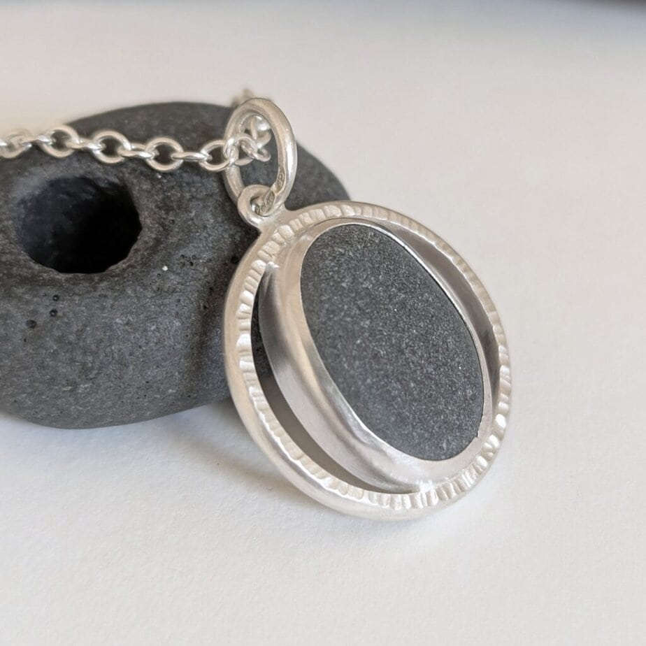 This gorgeous pendant contains a pebble from Colonsay, naturally smoothed and shaped by the sea, and set in recycled sterling silver. Each stone has real depth and character. Handmade and hallmarked by Hazel’s Sea Jewellery.